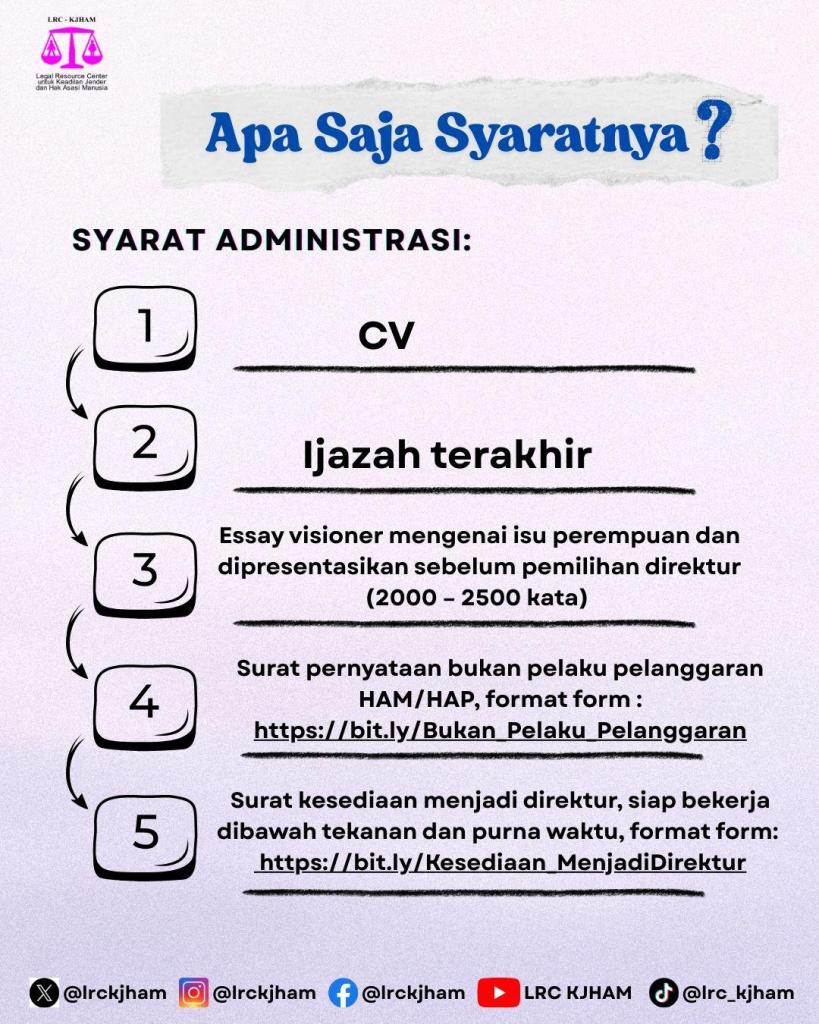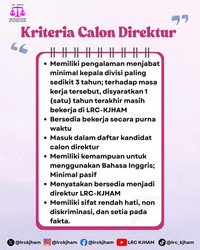 Atas nama Panitia Pemilihan Direktur LRC-KJHAM Tahun 2025, menyampaikan informasi tentang Pemilihan Direktur LRC-KJHAM Periode 2025 s/d 2027.